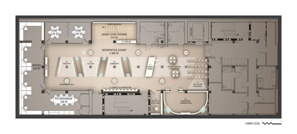 In addition to these public-facing experiences, the lower level will house essential museum offices and conference spaces, as well as dedicated classrooms for Italian language instruction, further advancing the Museo’s commitment to education, cultural preservation, and community engagement.