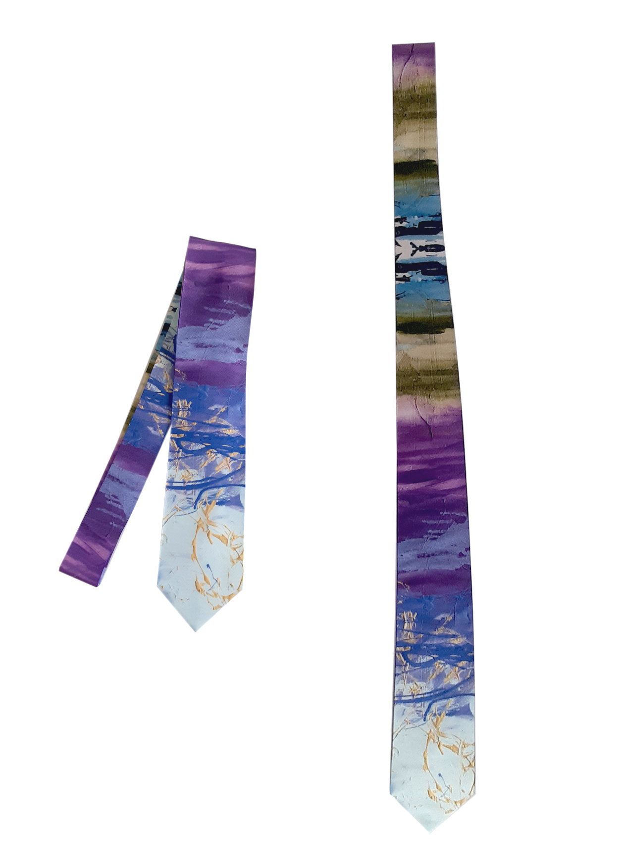 These ties are a poly-blend fabric, created and designed by the artist, Serena Bocchino. Each tie is inspired by Bocchino’s painting Purple Squeeze or Together Again. If you like this design, come by the Museo to find more of Bocchino’s artworks in her exhibition, Rhapsody.