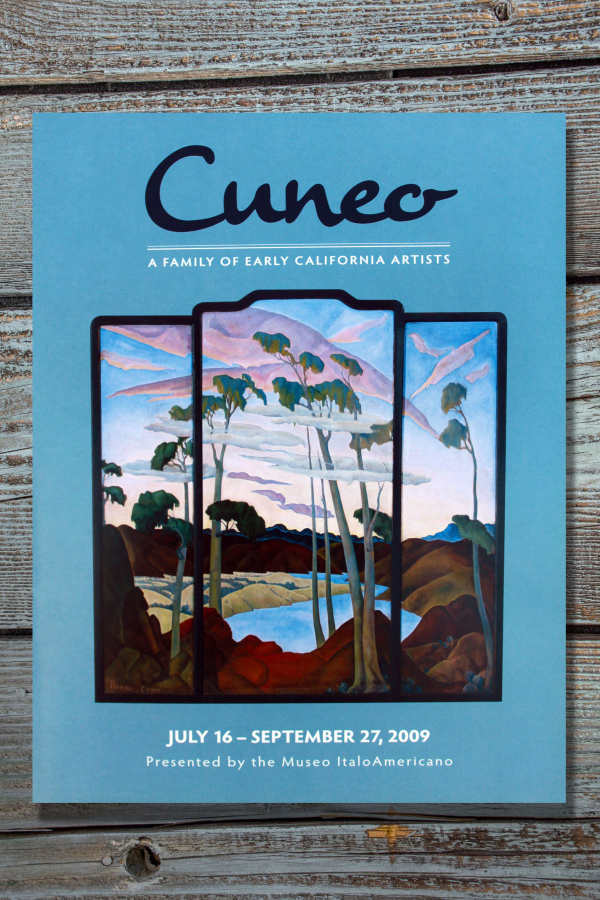 Cuneo – A Family of Early California Artists exhibit catalog. This exhibit was displayed at the Museo Italo Americano in San Francisco in 2009. This catalog tells the story of three talented, artistic brothers growing up in San Francisco; Rinaldo Cuneo, Cyrus Cuneo and Egisto Cuneo, and is accompanied by several photographs of their works.