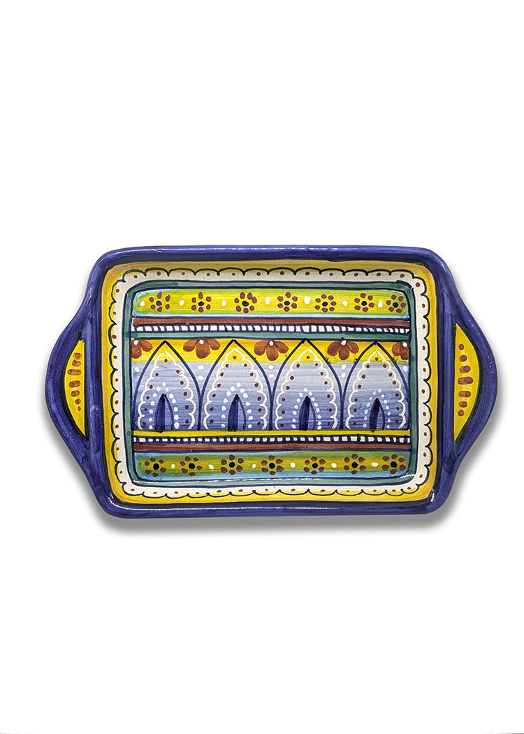 Bring a touch of vibrant Italian charm to your table with this stunning hand-painted ceramic serving tray. Inspired by traditional Deruta patterns, this rectangular tray features rich hues of cobalt blue, sunflower yellow, and earthy terracotta, accented by intricate floral and geometric motifs. The symmetrical design includes arches and dot detailing that evoke classic Umbrian craftsmanship.