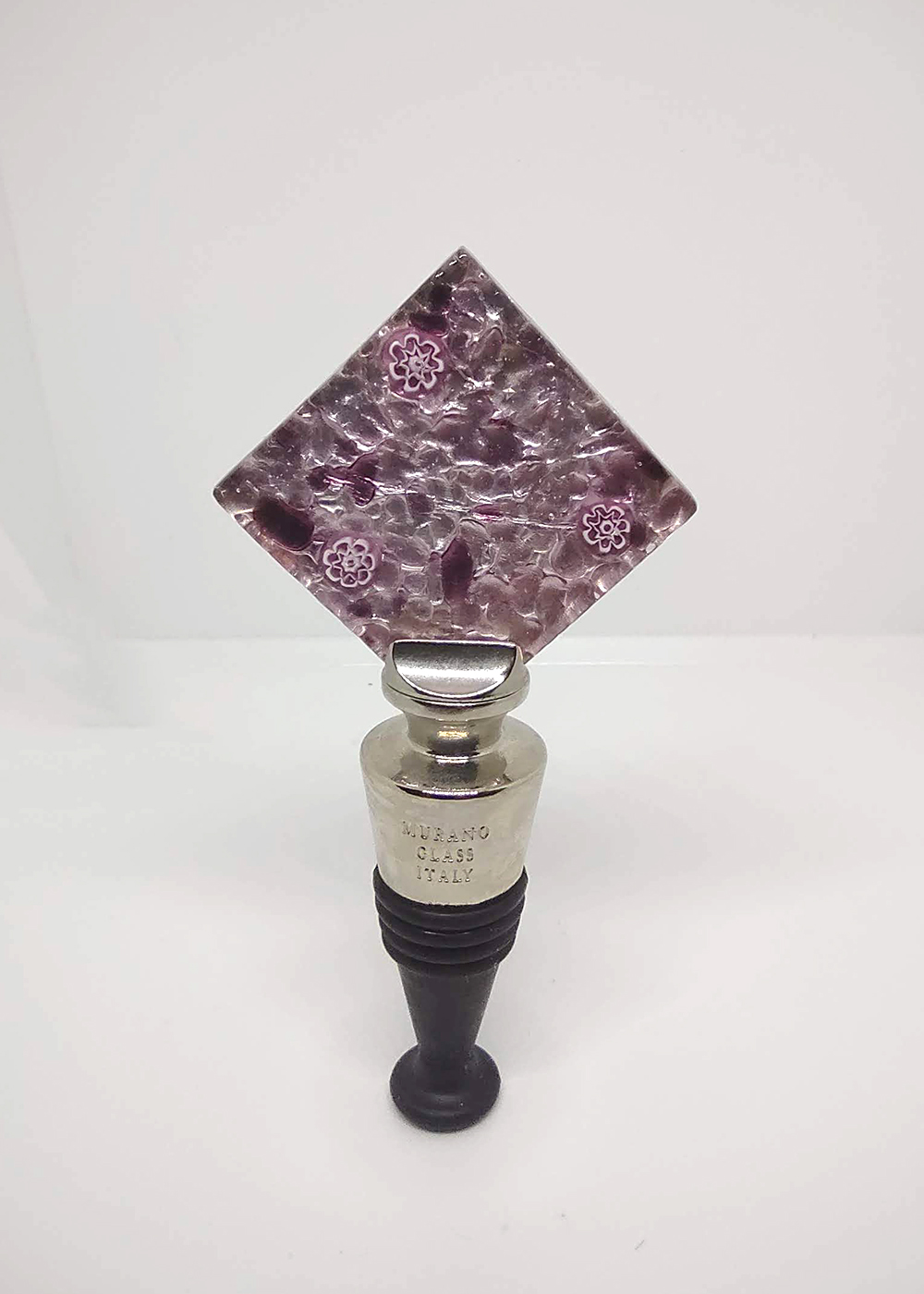 Add a touch of elegance to your life with this Murano wine bottle stopper. With a square base made of plum and cream waves topped with lovely lilac flowers, this stopper is the subtle touch of elegance perfect for any household.