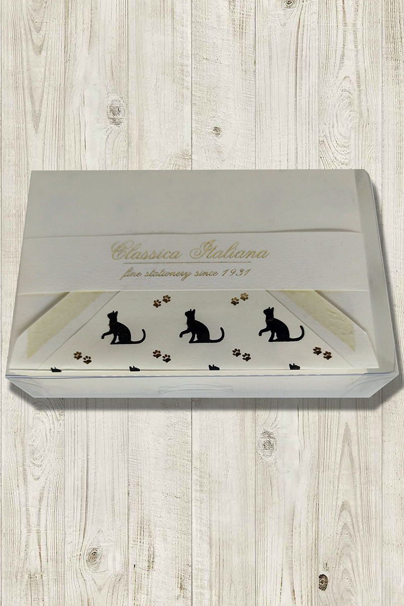Sending a letter from this set is truly a gift in its own right! Crafted by Rossi 1931, this card set is a testament to their commitment to quality and artistry. Each card is lovingly crafted from the finest cotton paper, with black cats and gold pawprint adornments. Designed with cat lovers in mind; these cards are more than just stationery, they are a heartfelt expression of affection.